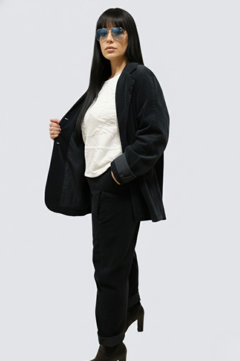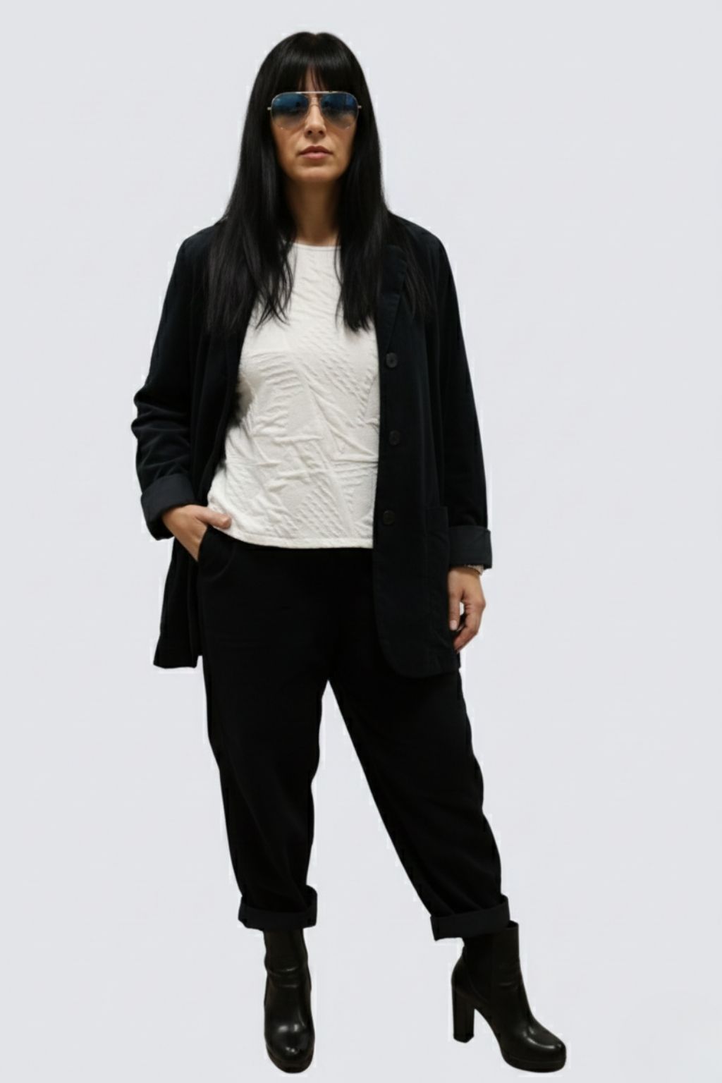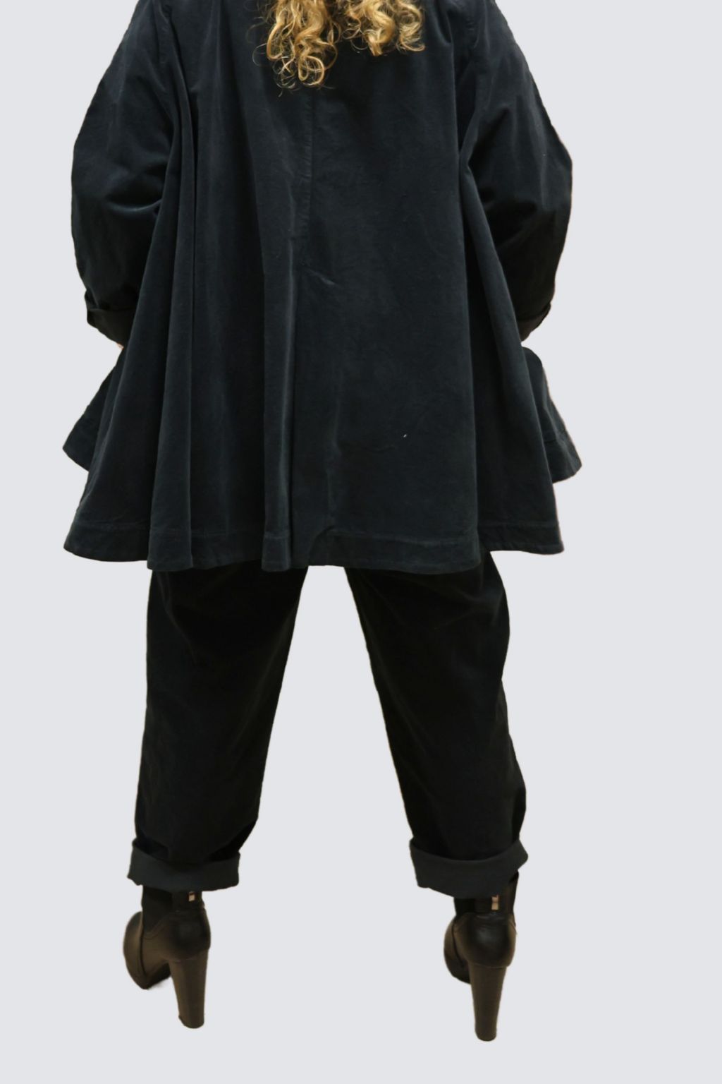 Giacca trapezio velluto liscio con tasche a toppa.