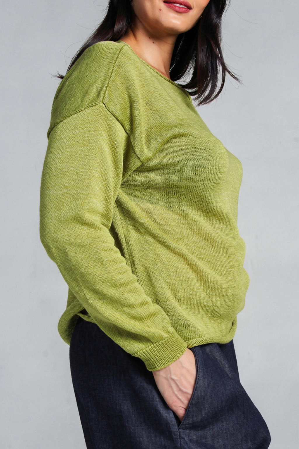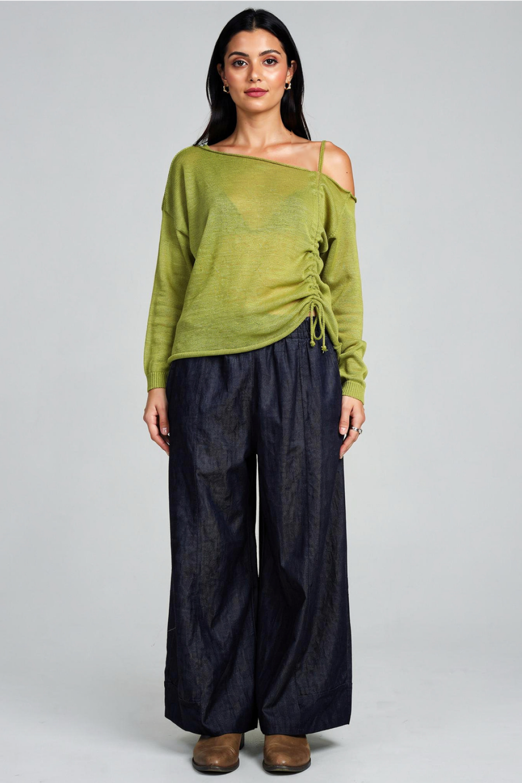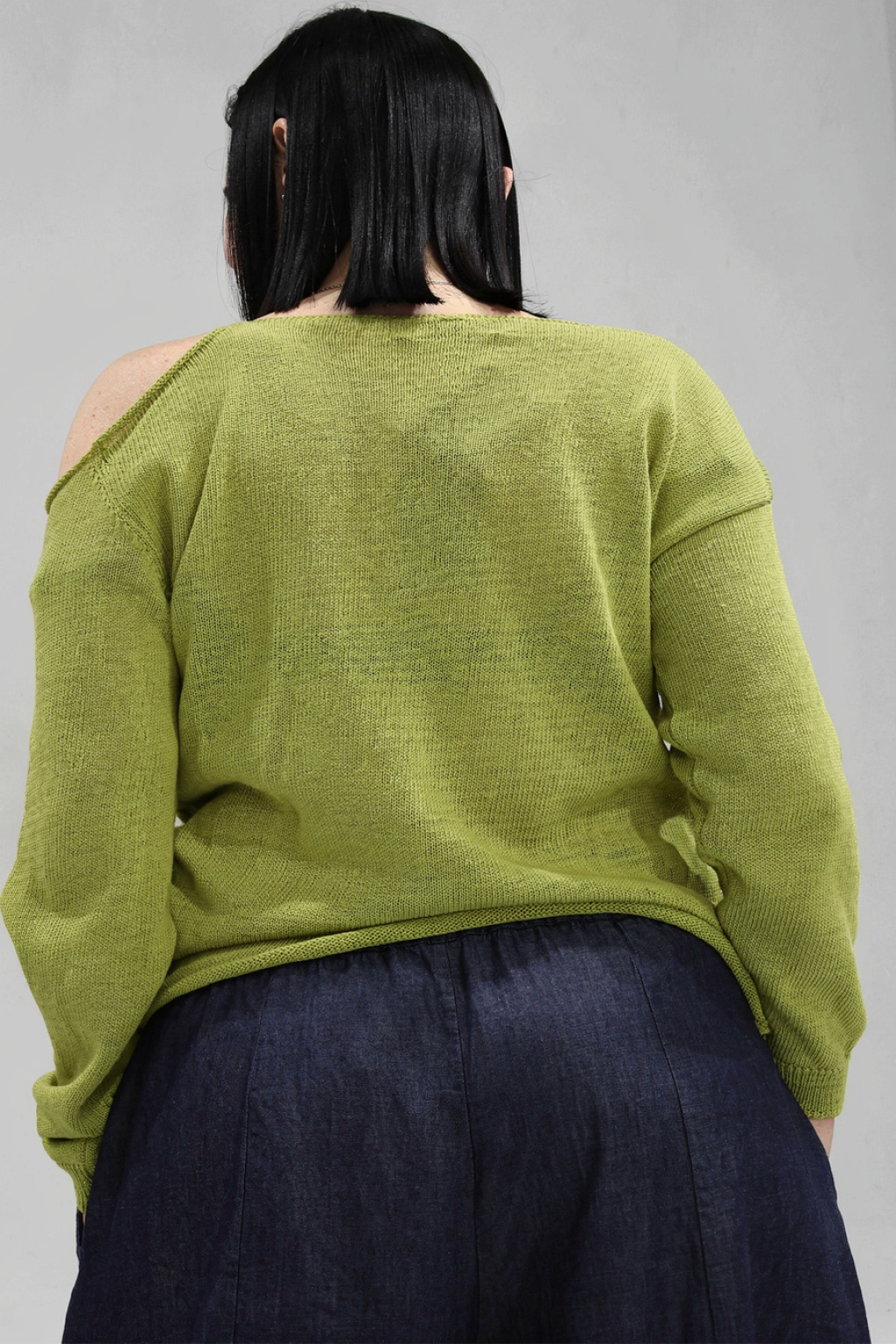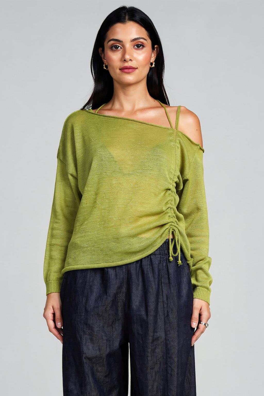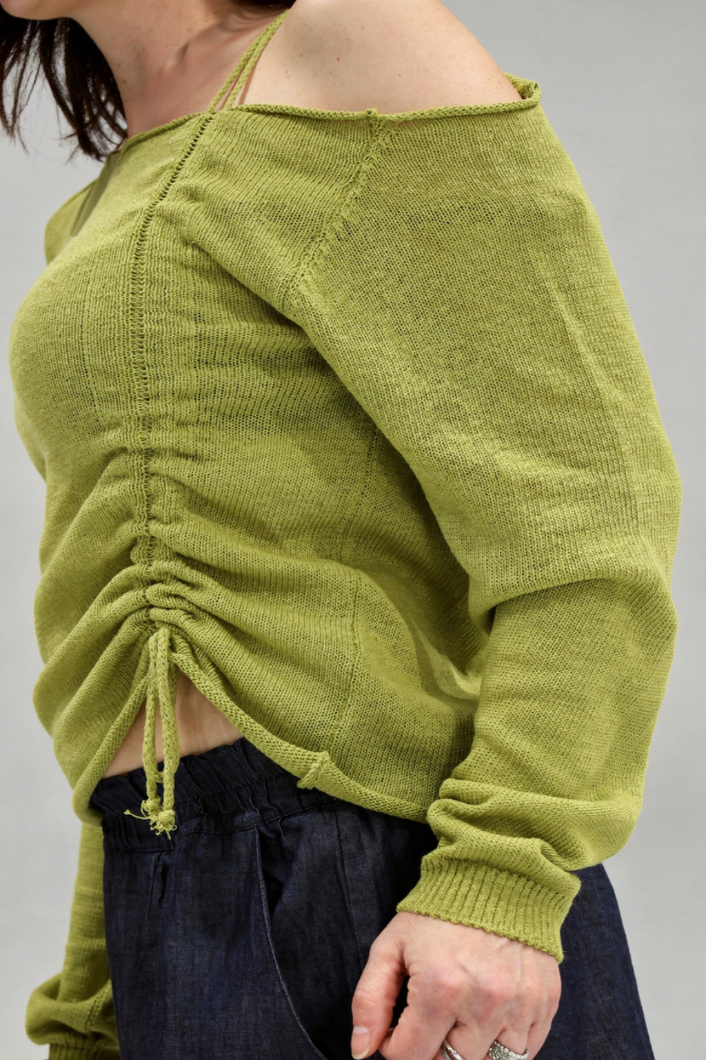 Maglia in filo monospalla ed arricciata davanti.