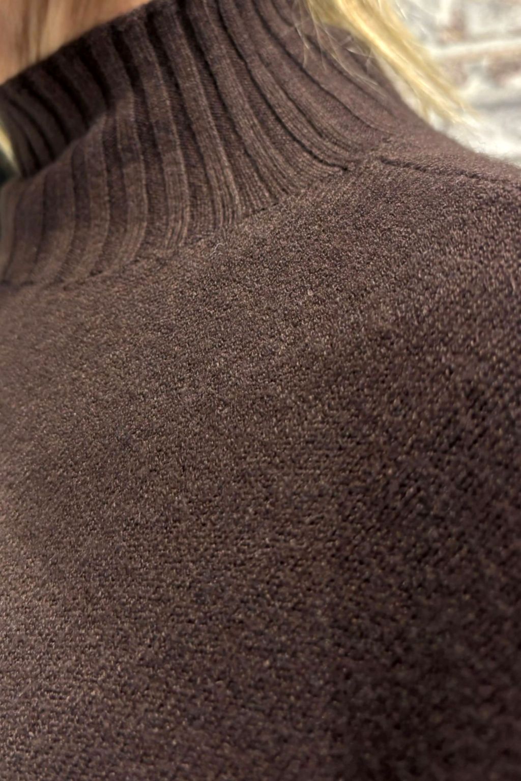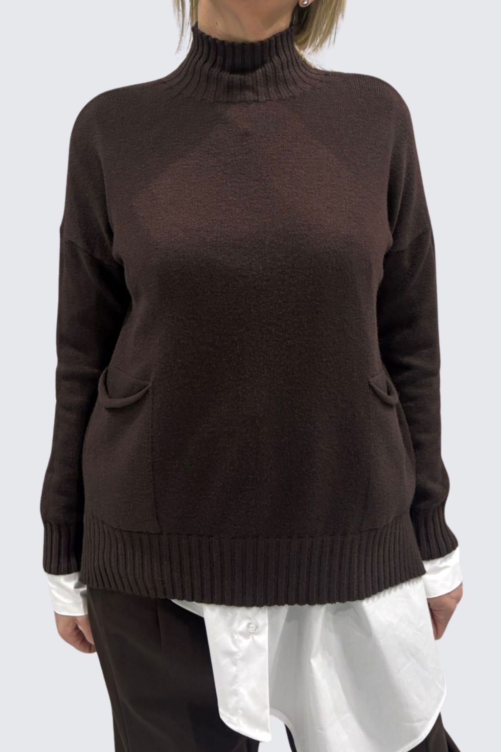Maglia collo lupetto a coste con tasche sul basso.