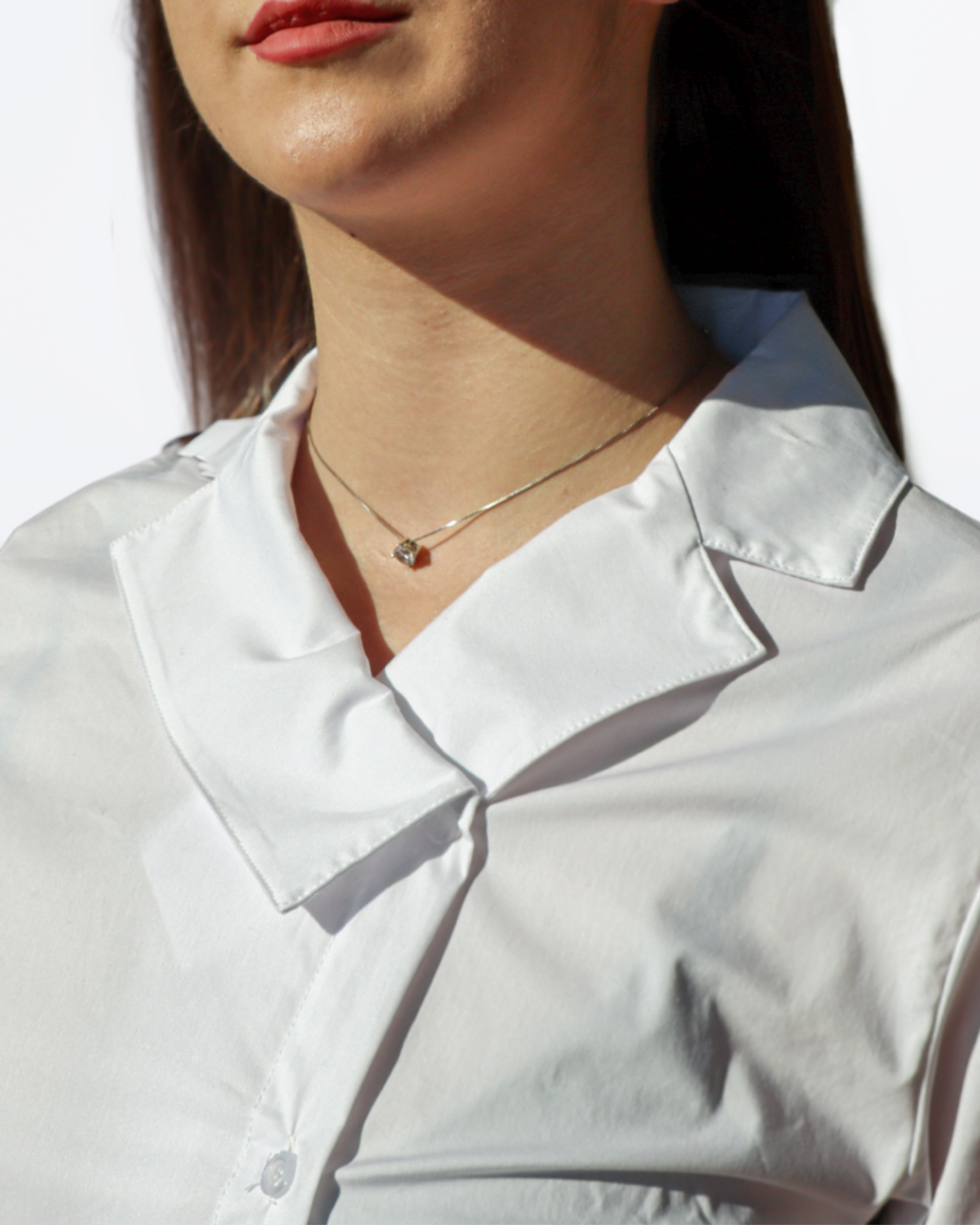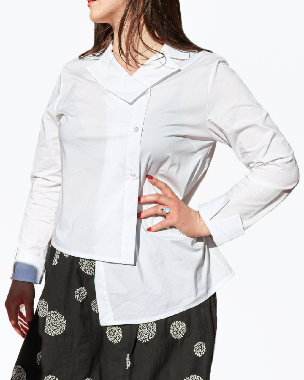 Camicia con collo stondato, asimmetrica e polso con risvolto.