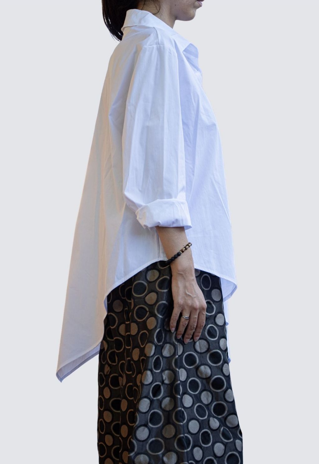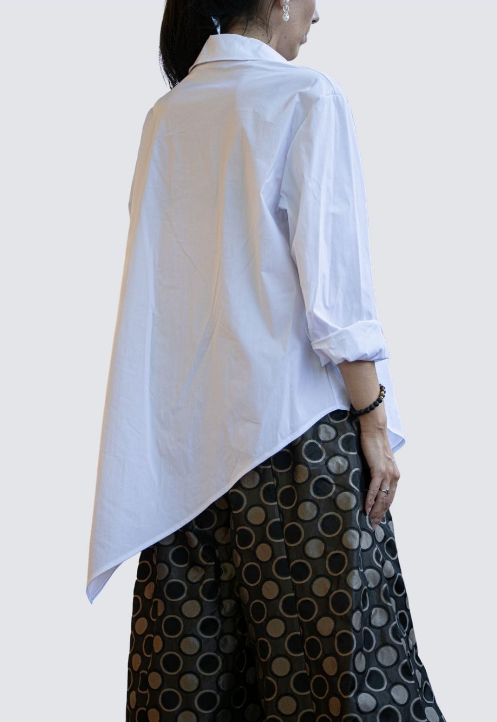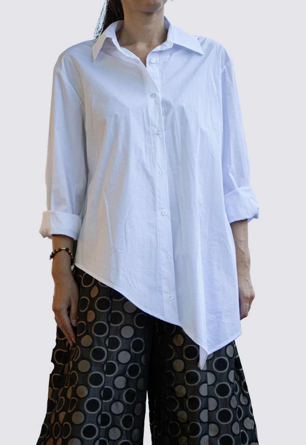 Camicia in rasatello di cotone con punta laterale, ottima vestibilità, taglia unica. Colori: bianco e nero.