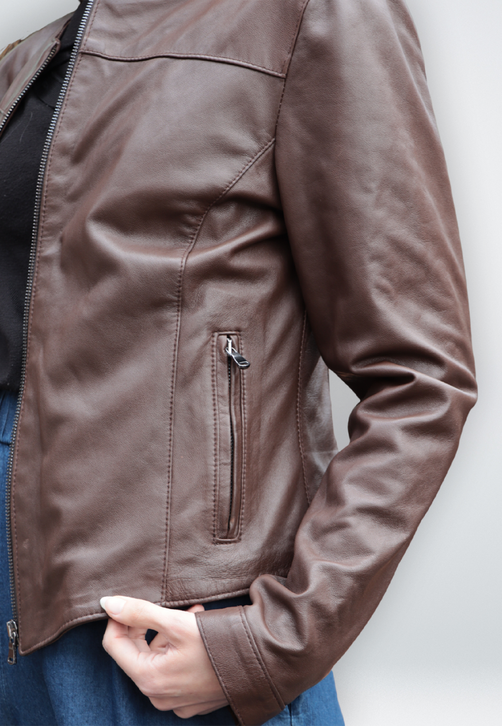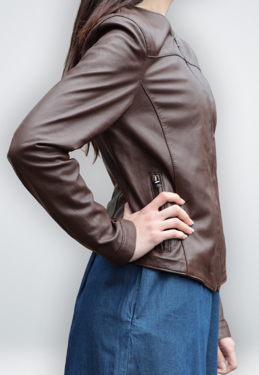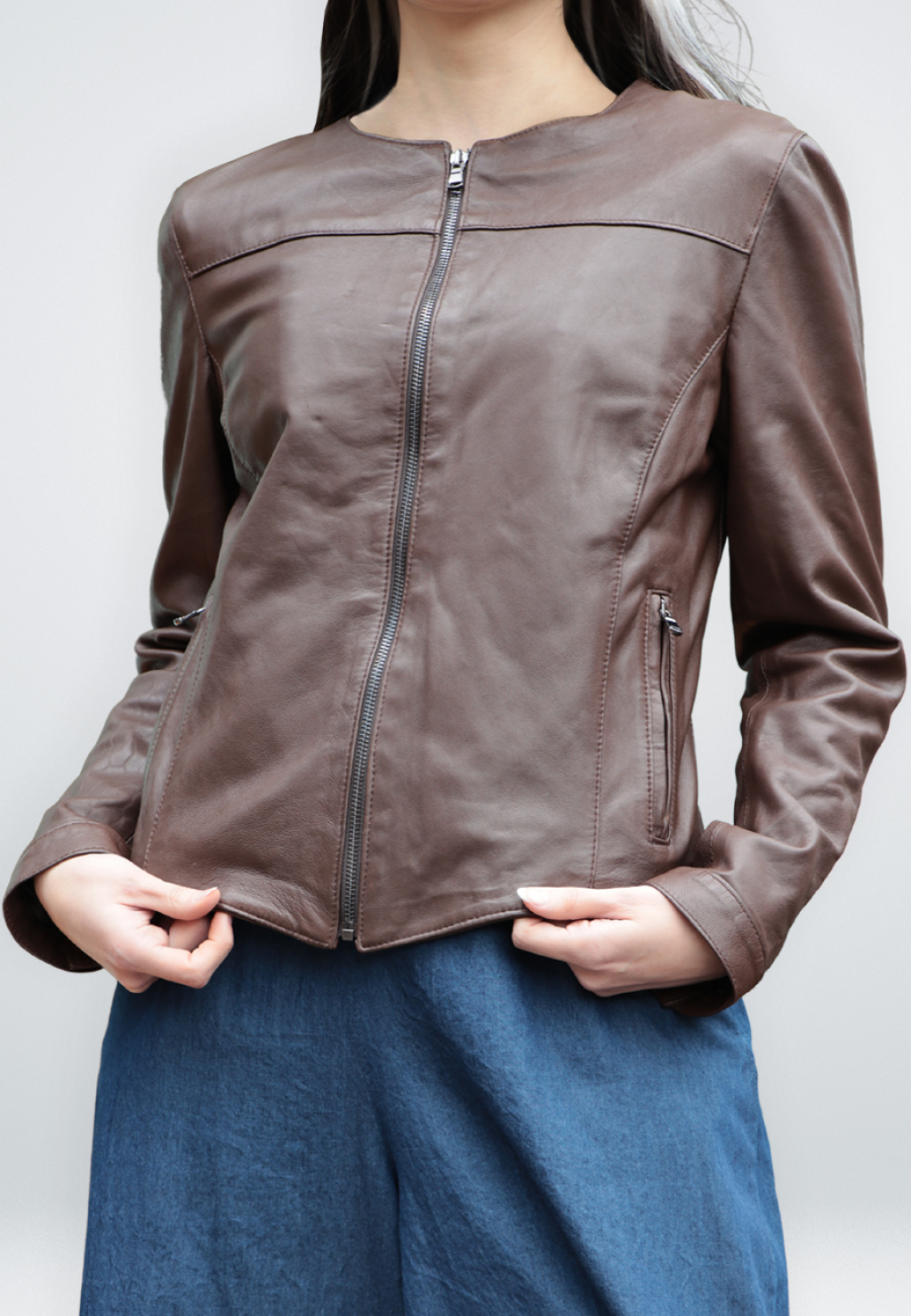 Giacca 100% pelle modello avvitato, senza collo, chiusura zip centrale e tasche laterali chiuse con zip.