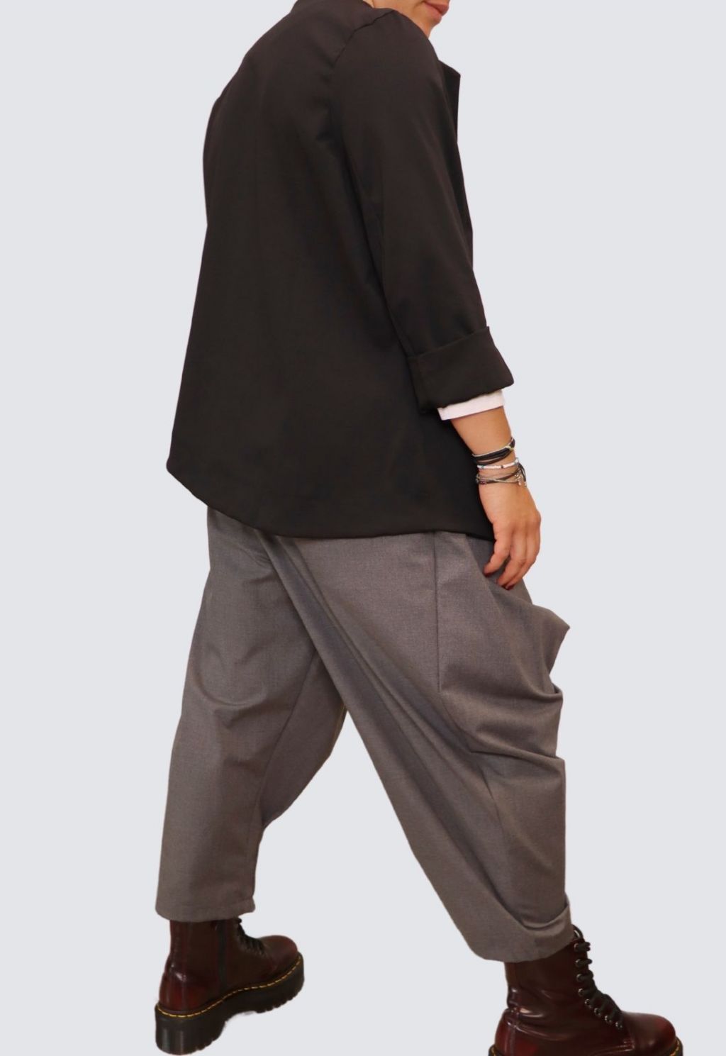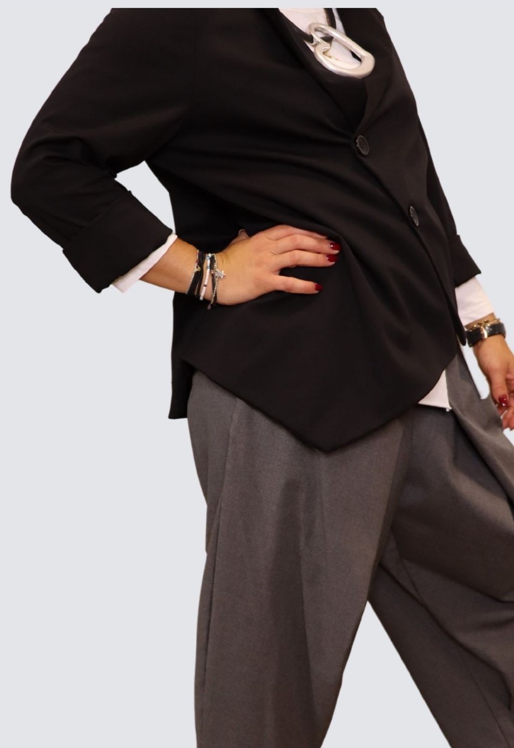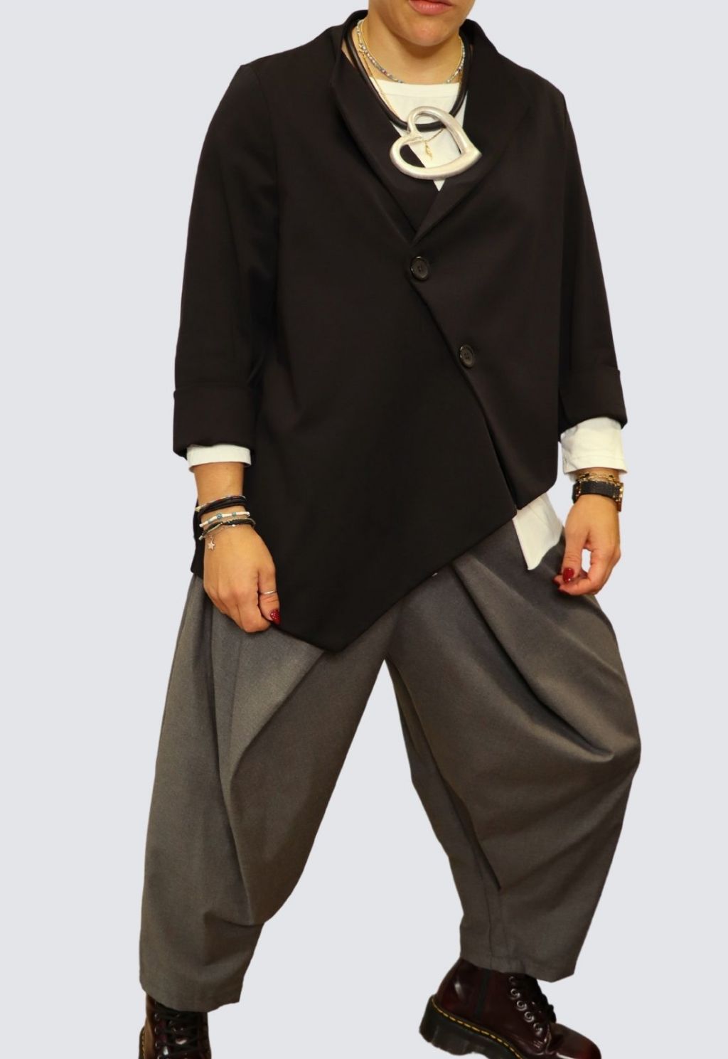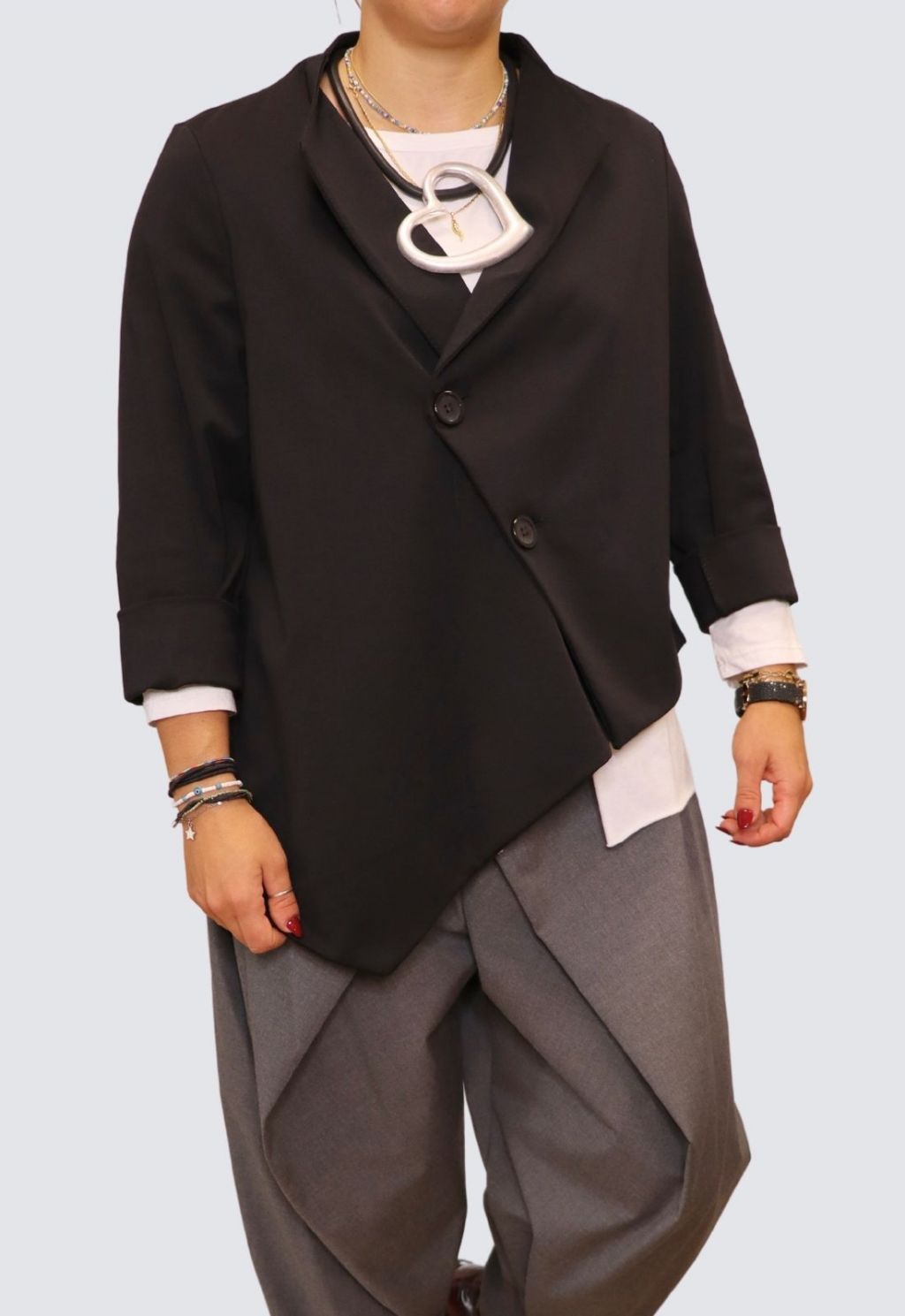 Giacca in punto Milano, linea asimmetrica e bottoni storti, taglia unica.Colori: nero, bianco, beige.