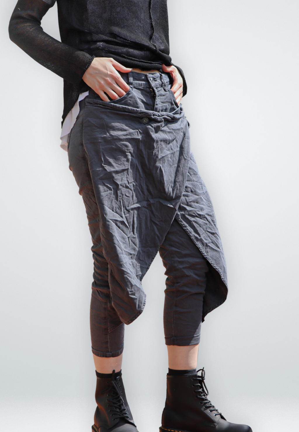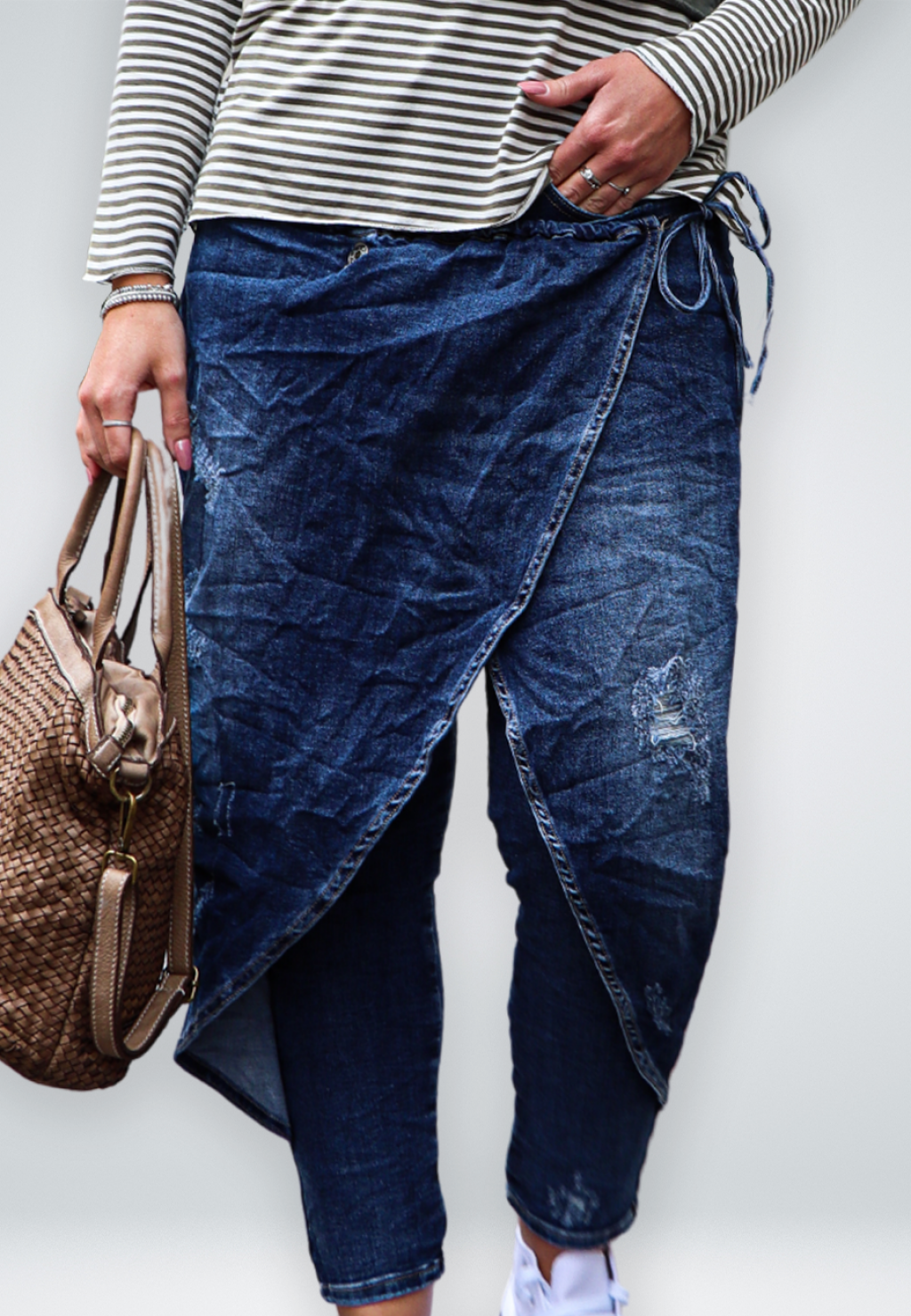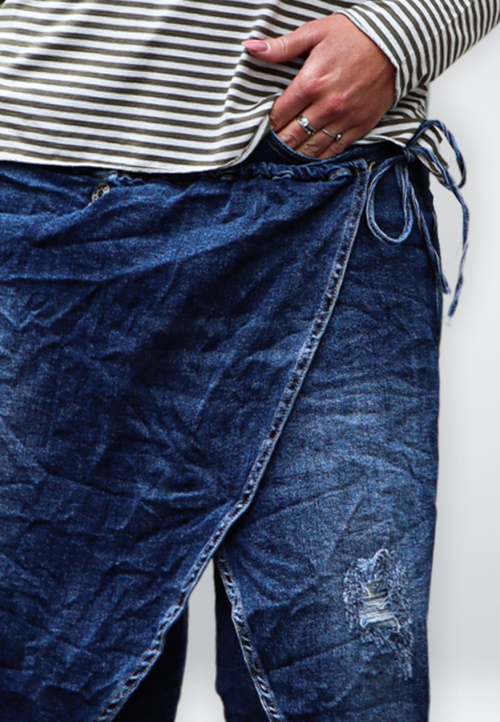 Jeans con patta chiusa lateralmente con un laccio, con molature. Jeans elasticizzato sul resto della gamba. Ottima vestibilità.