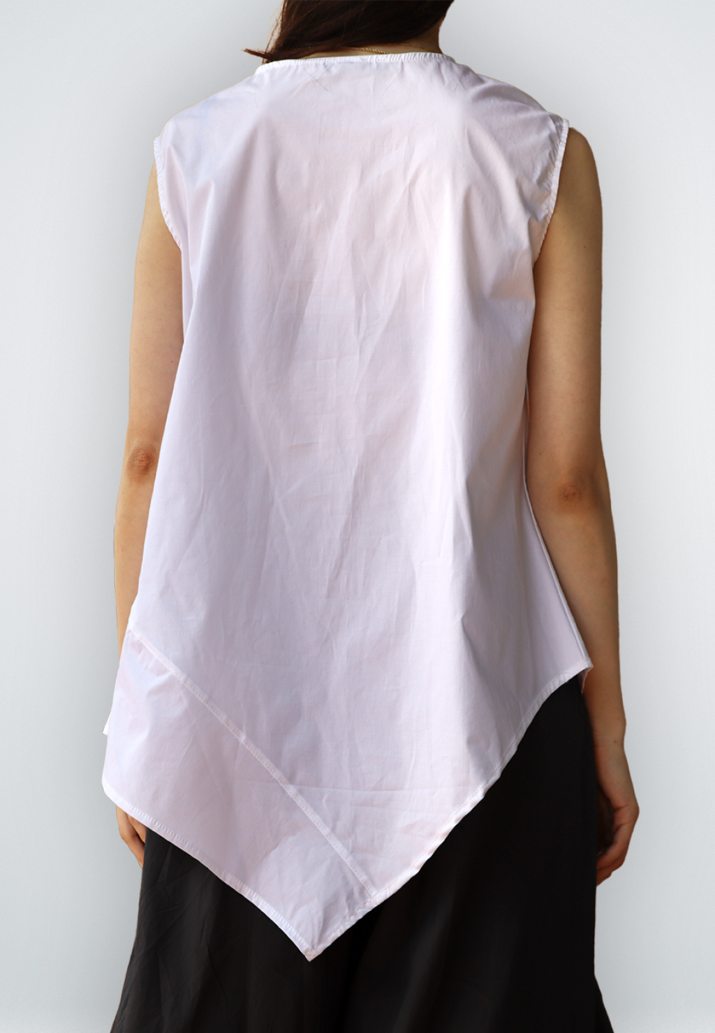 Maglia smanicata asimmetrica con piega a punta sul davanti e sul retro.
