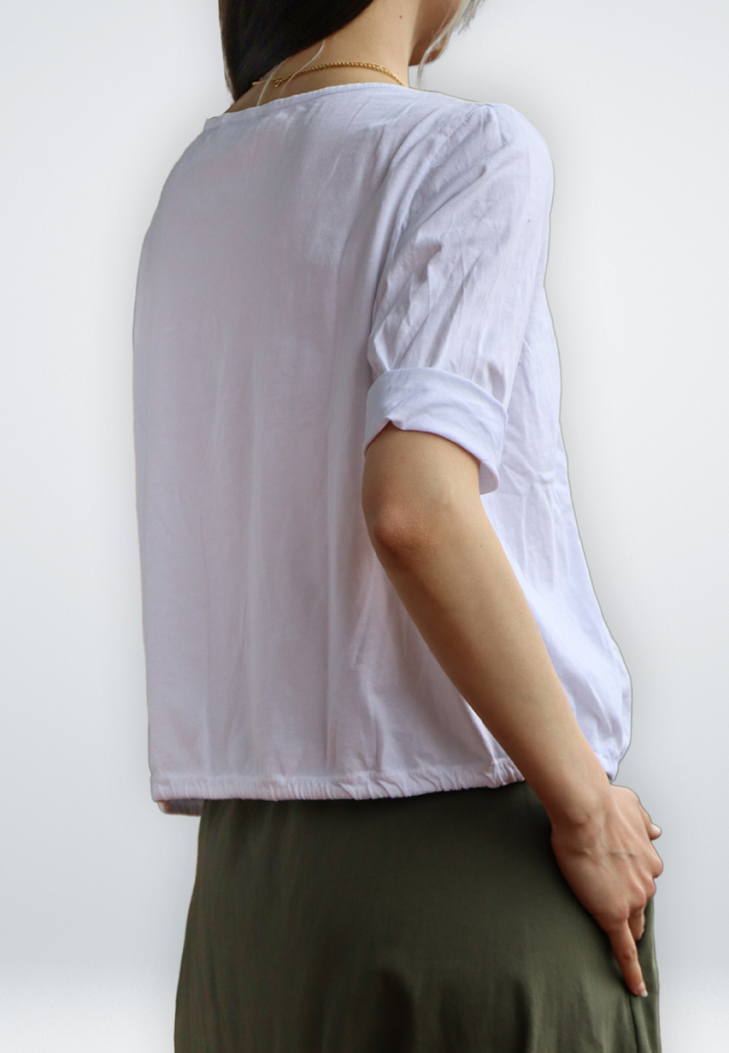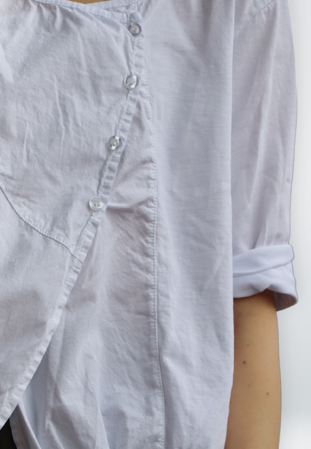 Maglia con abbottonatura laterale e laccetto sotto per regolarne la larghezza.