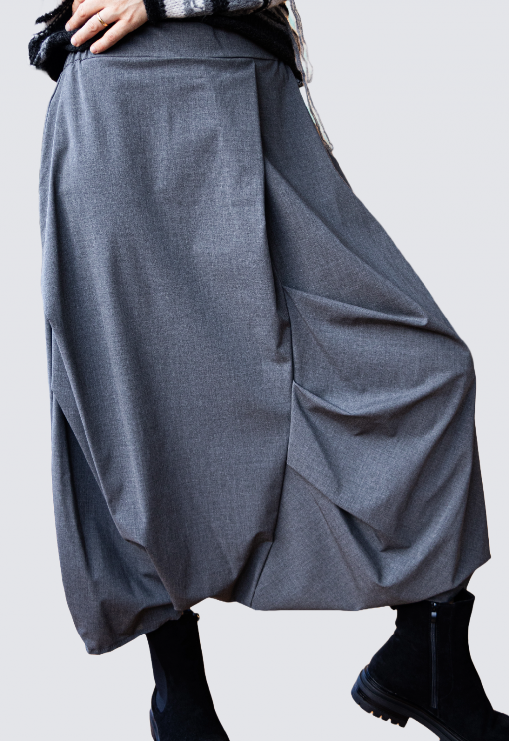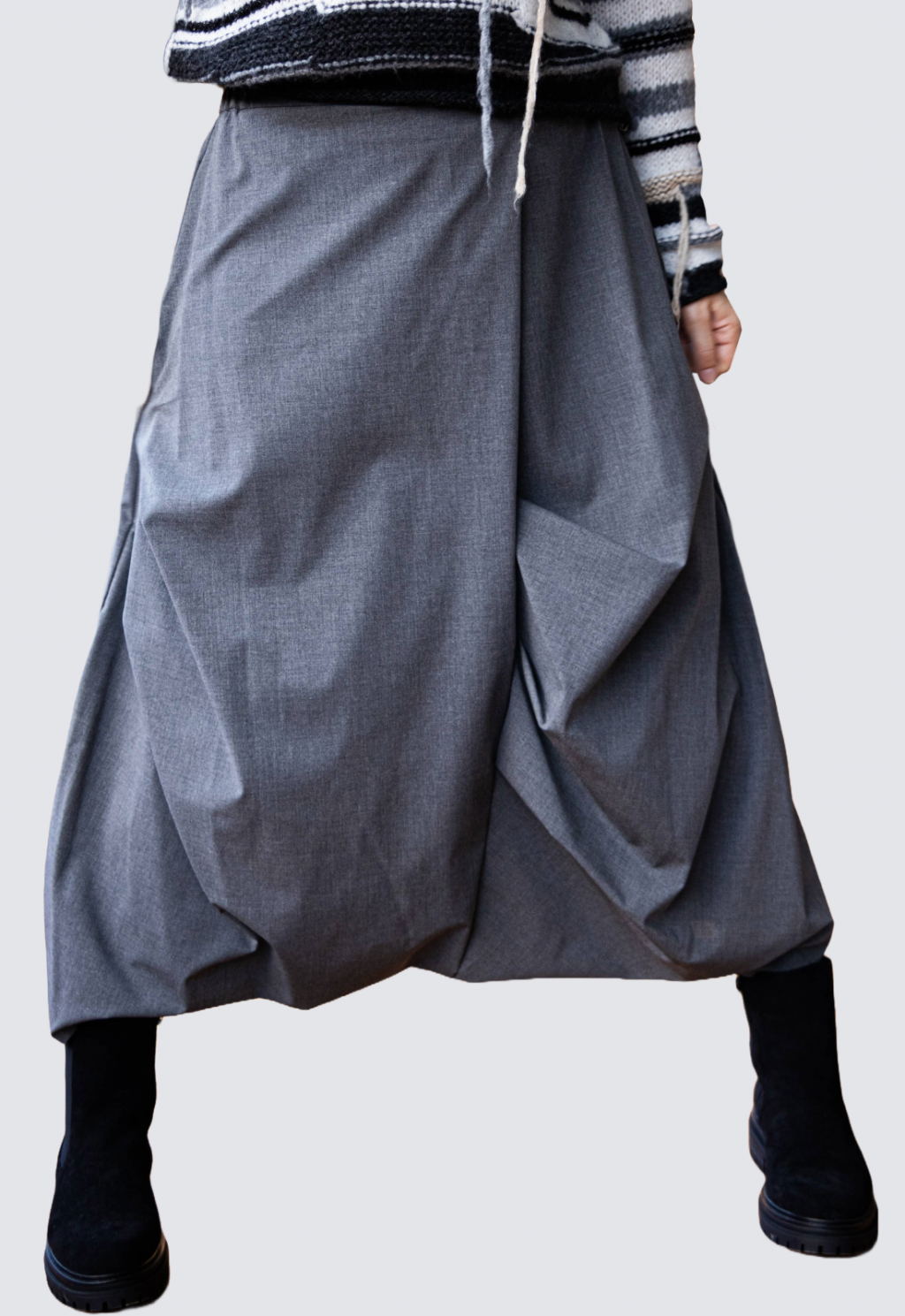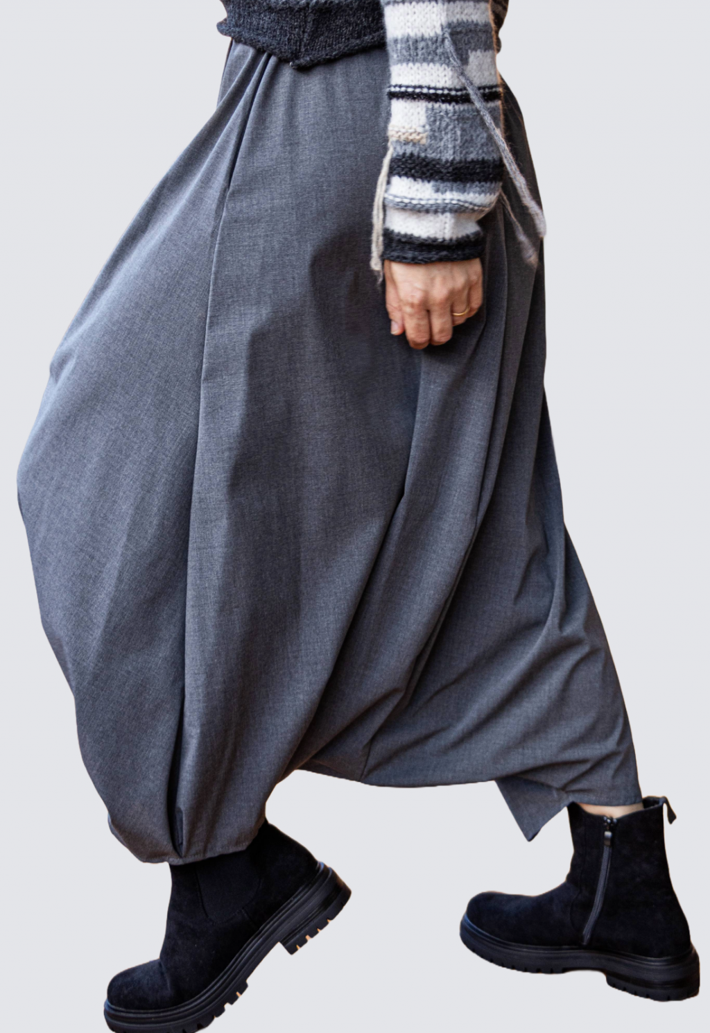 Pantalone con cavallo basso e drappeggi sul davanti, elastico dietro e tasche laterali.Taglia unica. Colori: nero, grigio.
