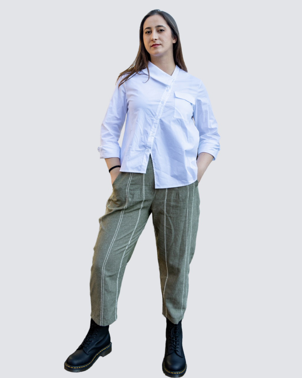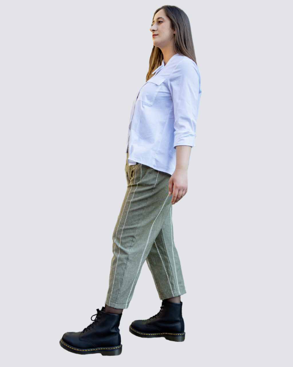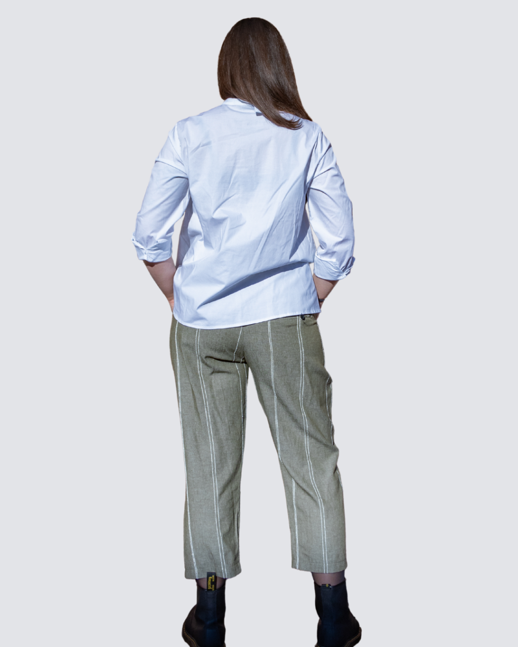 Pantalone rigato con tasche e bottoni dietro.